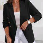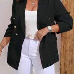 Las hombreras estructuran la silueta y aportan carácter, mientras los botones dorados elevan el diseño con un toque sofisticado.